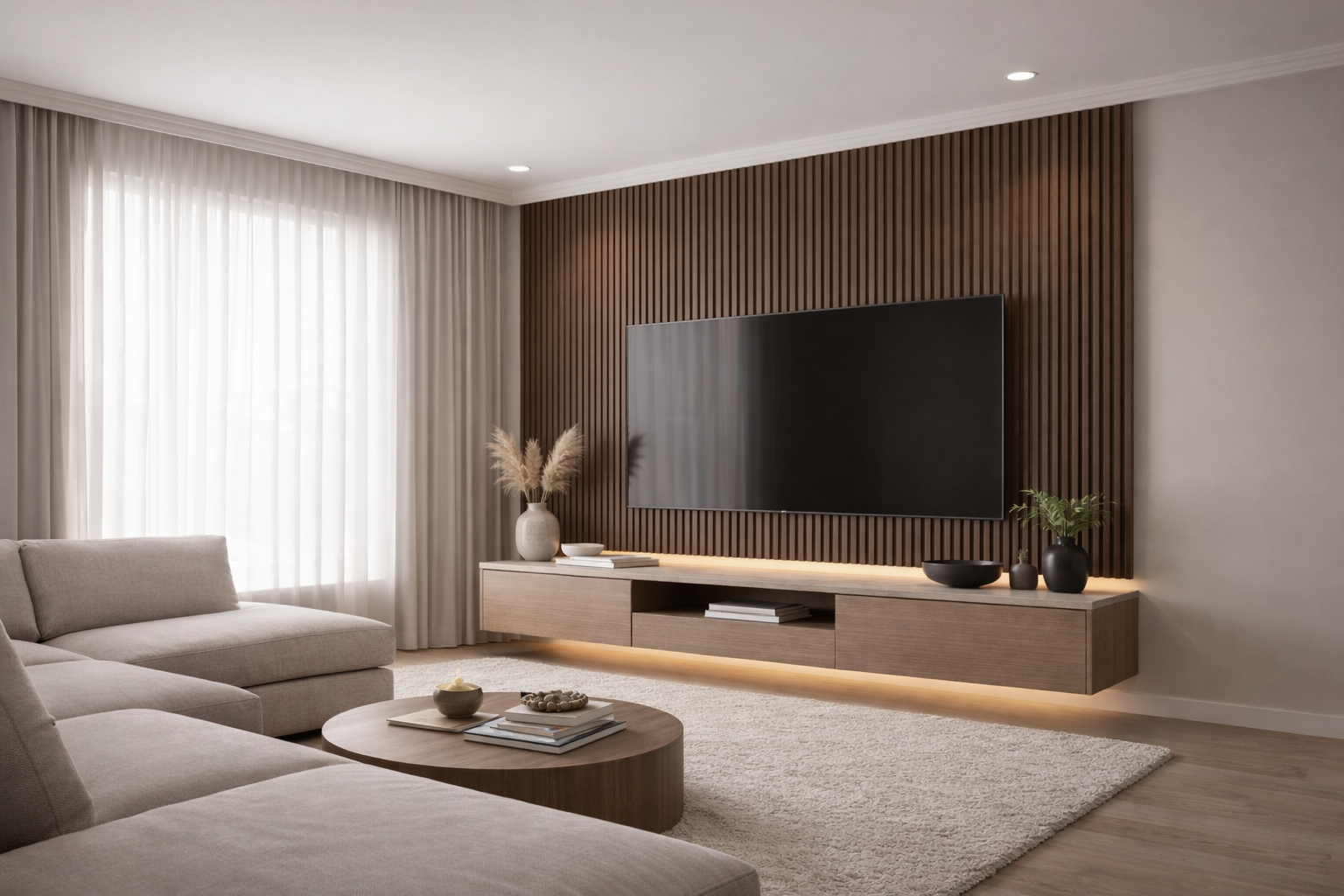 Minimal-style media wall: TV mounted flush, slim open shelves, neutral finishes for a modern, minimalist living room.